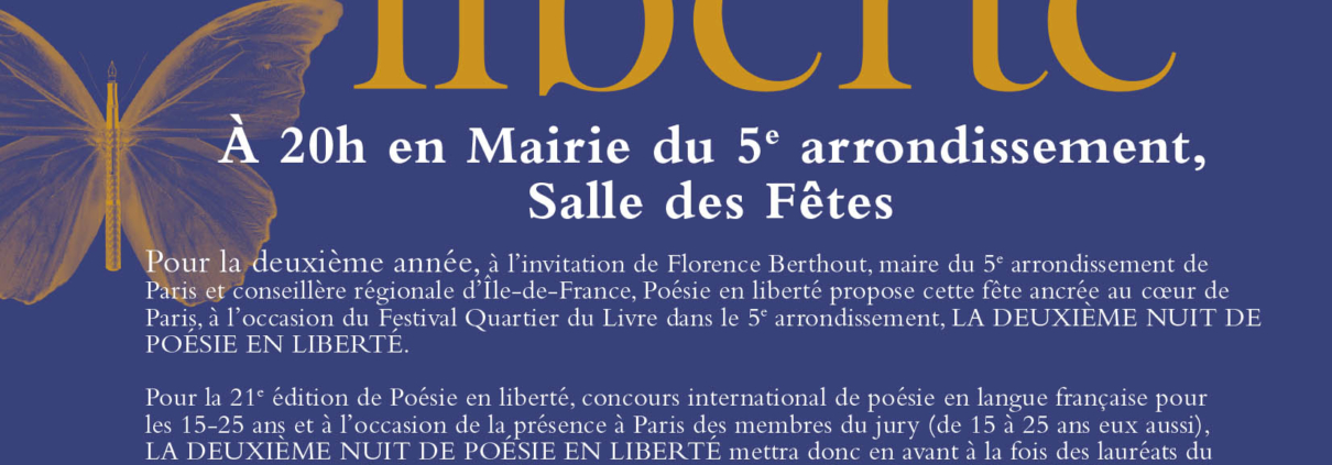 Pour la deuxième année, à l’invitation de Florence Berthout, Maire du 5ème arrondissement de Paris et Conseillère régionale d’Île de France, Poésie En Liberté (concours international de poésie en langue française, via Internet, pour les 15-25 ans) propose cette fête ancrée au cœur de Paris, à l’occasion du Festival Quartier du Livre dans le 5ème arrondissement, la deuxième Nuit de Poésie en liberté.